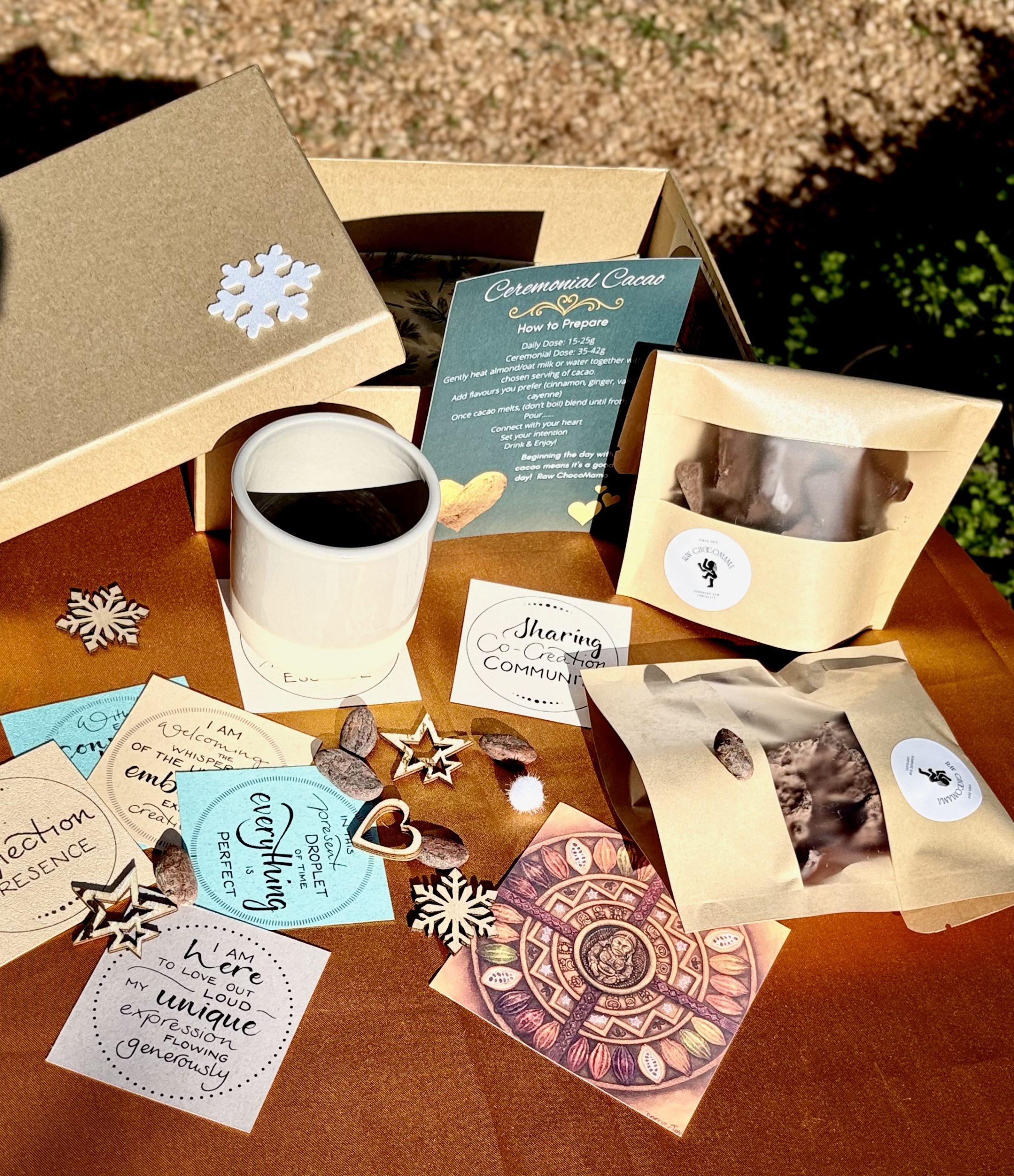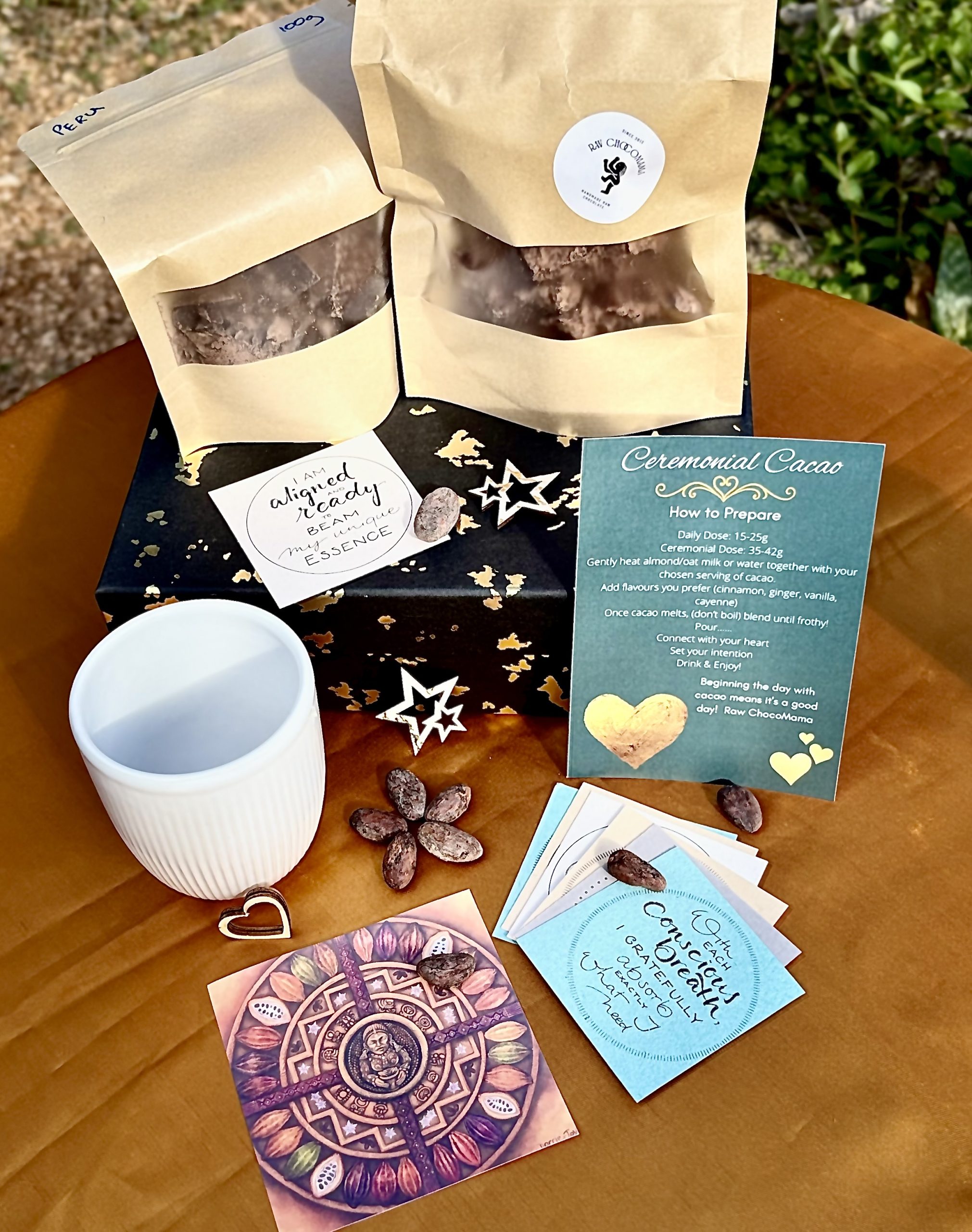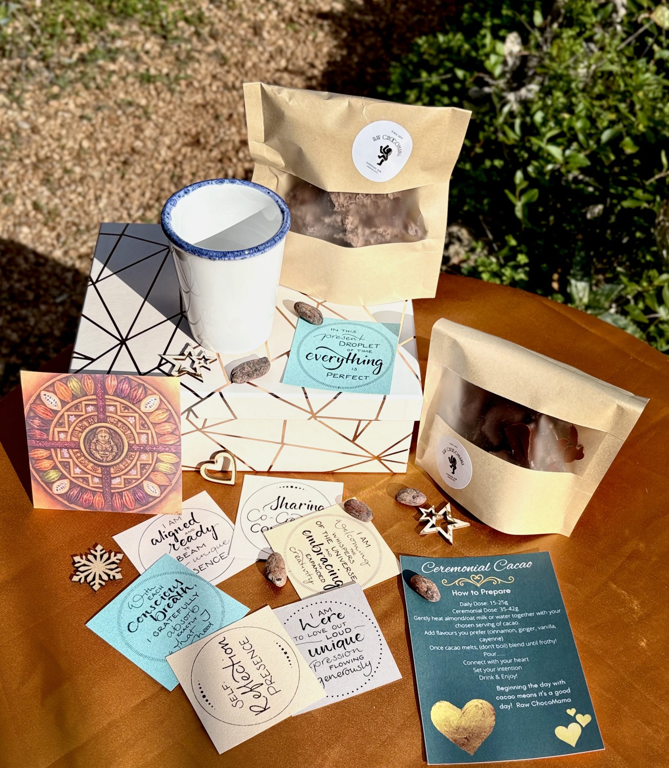 A set of 8 ‘Cacao Chargers’. You can choose the mood you want to bring into your day and place this under your cup to infuse your cacao goodness with this energy. There is a blank one so that you can create your own too!